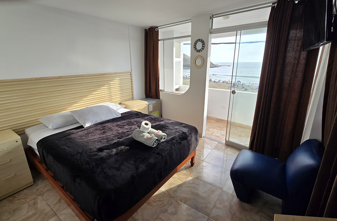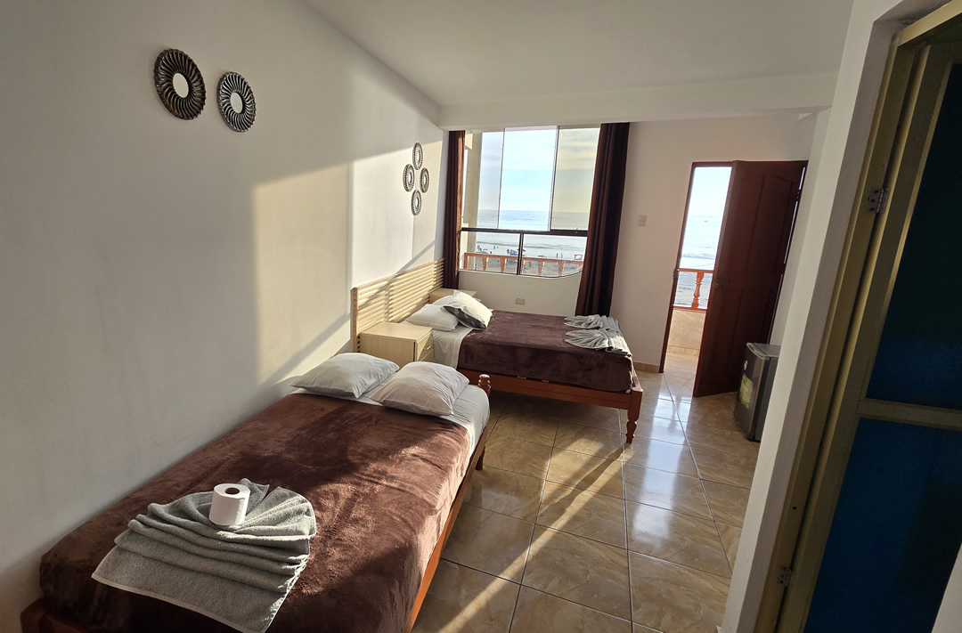 Una comoda habitación con 2 camas, con balcón vista al mar y baño completo.